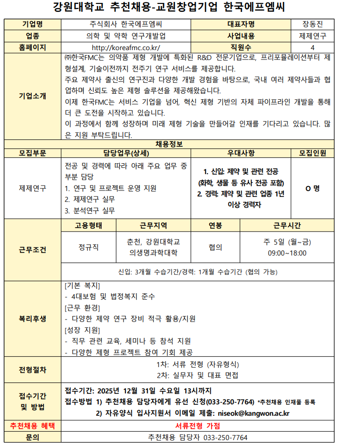 [공지] (주) 한국 FMC 추천채용 안내 (12/31 수요일 13시까지)