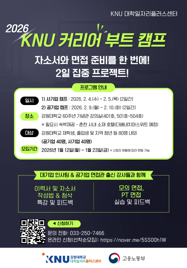 KNU 대학일자리플러스센터 2026 커리어 부트 캠프 참여 안내 (1/23 금요일 17:00까지)
