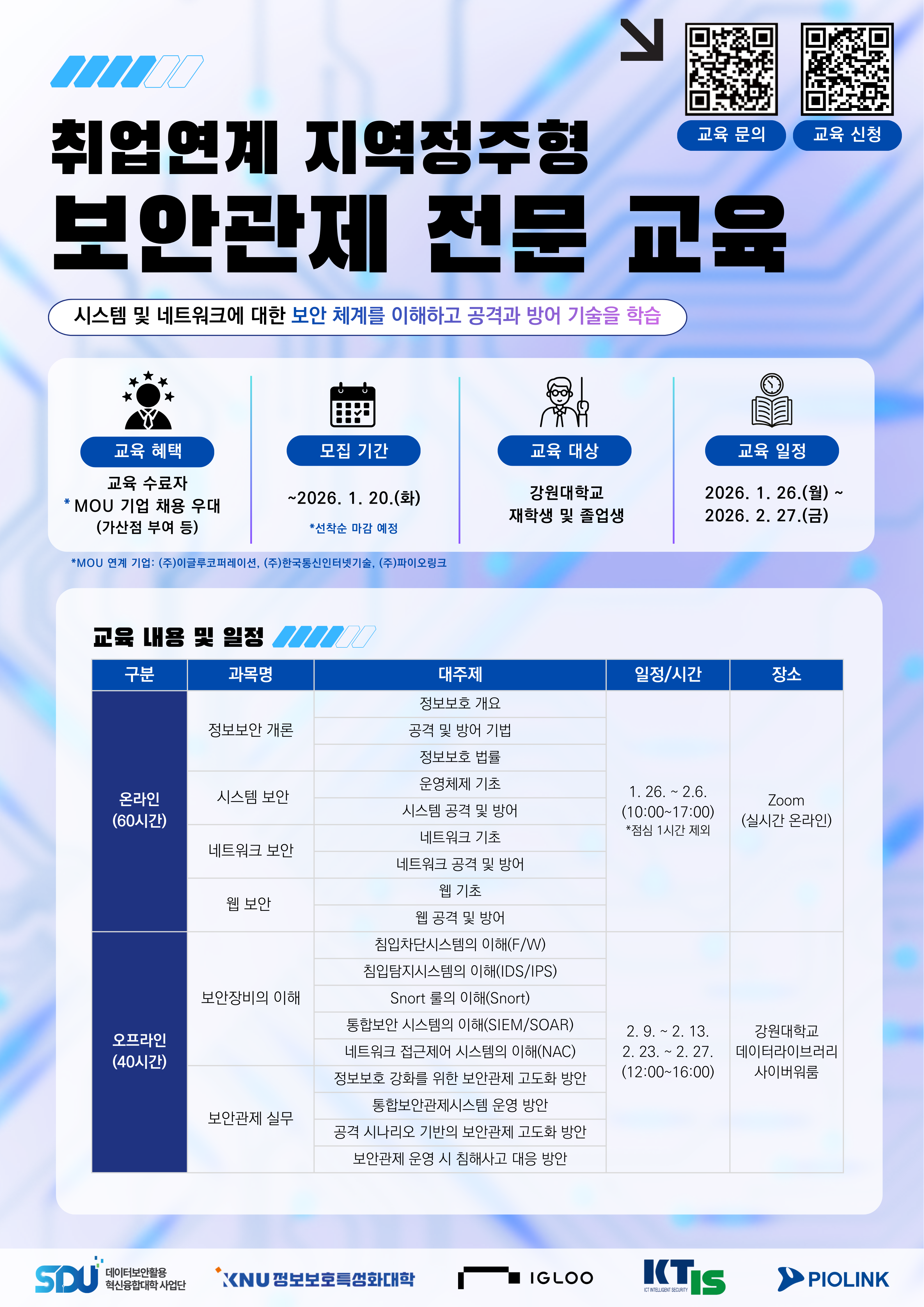 2026 취업연계 지역정주형 보안관제 전문 교육 홍보 (1/20 화요일까지)
